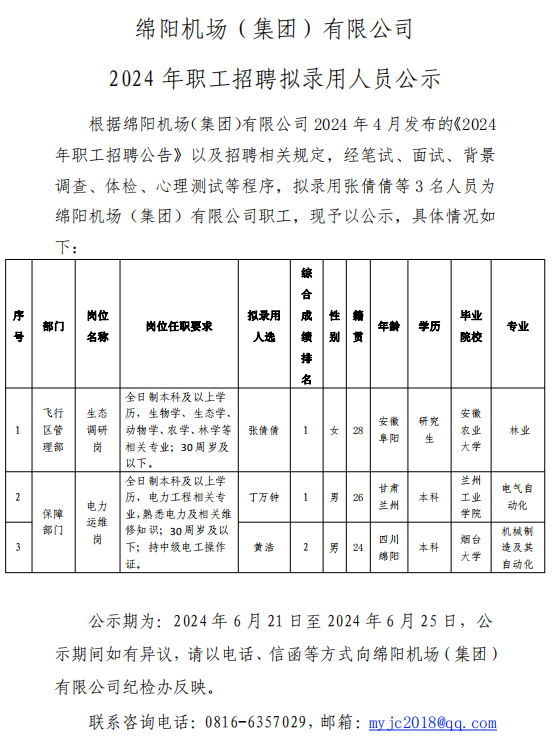 綿陽機(jī)場(集團(tuán))有限公司 2024 年職工招聘擬錄用人員公示