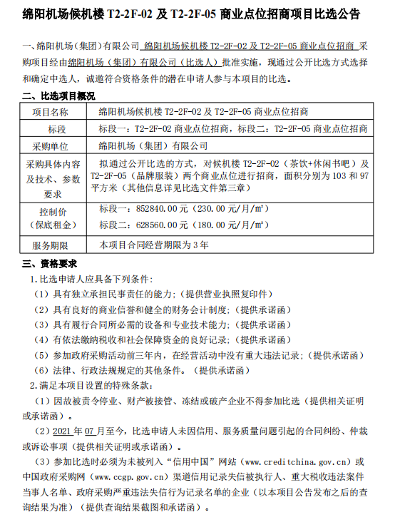 綿陽(yáng)機(jī)場(chǎng)候機(jī)樓 T2-2F-02及T2-2F-05 商業(yè)點(diǎn)位招商項(xiàng)目比選公告